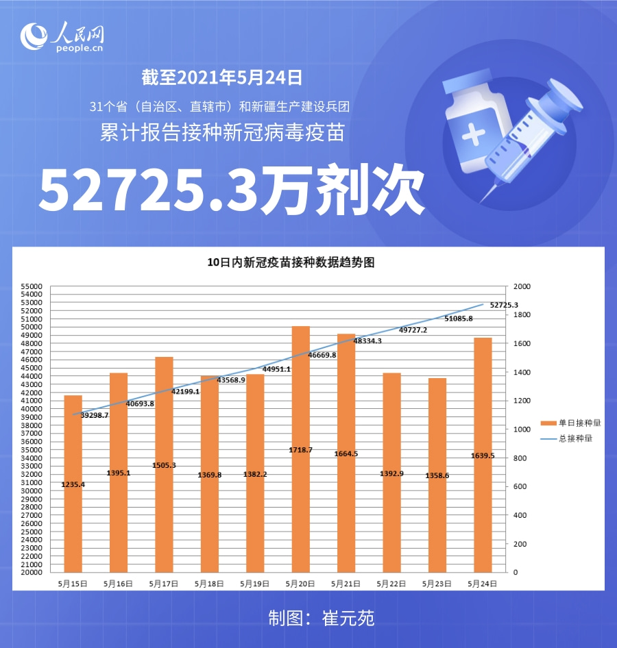 人民網(wǎng)北京5月25日電 (記者崔元苑)據(jù)國家衛(wèi)生健康委官網(wǎng)消息,截至2021年5月24日,31個省(區(qū)、市)及新疆生產(chǎn)建設(shè)兵團(tuán)累計報告接種新冠病毒疫苗52725.3萬劑次。
