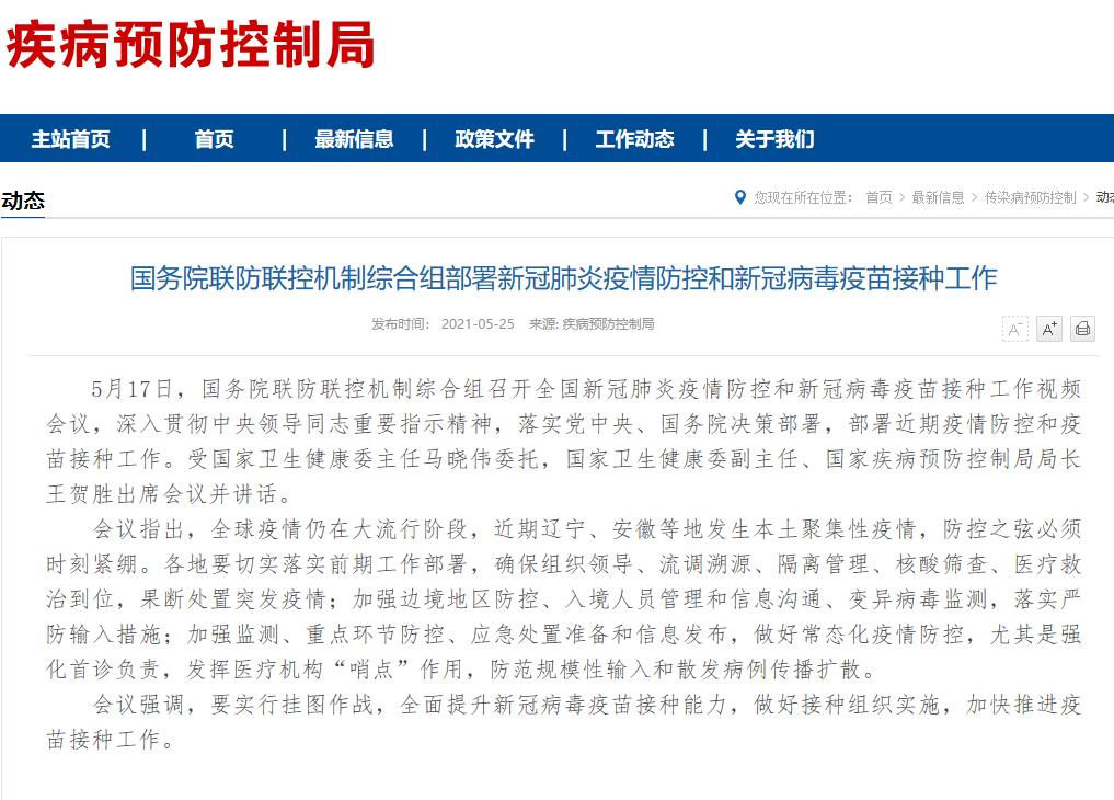 人民網(wǎng)北京5月25日電 (張文婷)近日,國(guó)務(wù)院聯(lián)防聯(lián)控機(jī)制綜合組召開全國(guó)新冠肺炎疫情防控和新冠病毒疫苗接種工作視頻會(huì)議,部署近期疫情防控和疫苗接種工作。會(huì)議強(qiáng)調(diào),要實(shí)行掛圖作戰(zhàn),全面提升新冠病毒疫苗接種能力,做好接種組織實(shí)施,加快推進(jìn)疫苗接種工作。