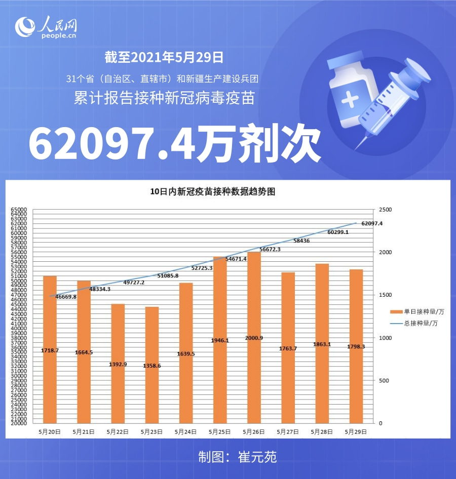 國(guó)家衛(wèi)健委:截至5月29日全國(guó)累計(jì)接種新冠病毒疫苗62097.4萬(wàn)劑次