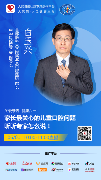 6月1日10:00至11:00,邀請(qǐng)到首都醫(yī)科大學(xué)附屬北京口腔醫(yī)院院長(zhǎng),中華口腔醫(yī)學(xué)會(huì)副會(huì)長(zhǎng)白玉興做客人民好醫(yī)生名醫(yī)直播欄目,探討兒童口腔常見(jiàn)的問(wèn)題,給公眾科普兒童口腔問(wèn)題的相關(guān)知識(shí)。