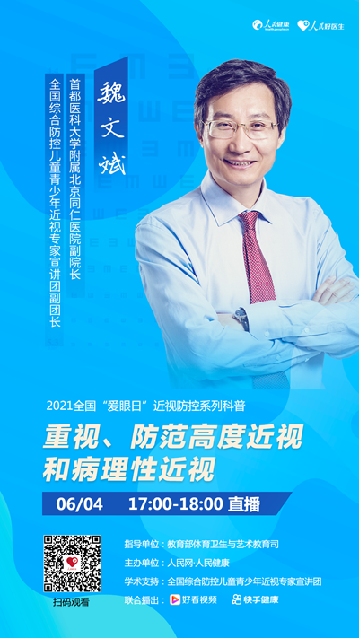 6月4日(周五)下午17:00至18:00,首都醫(yī)科大學(xué)附屬北京同仁醫(yī)院副院長(zhǎng)、全國(guó)綜合防控兒童青少年近視專家宣講團(tuán)副團(tuán)長(zhǎng)魏文斌將做客人民日?qǐng)?bào)社旗下新媒體“人民好醫(yī)生”客戶端,就“重視、防范高度近視和病理性近視”相關(guān)話題進(jìn)行在線分享,歡迎屆時(shí)收看。