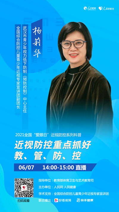 6月7日(周一)下午14:00至15:00,武漢市青少年視力低下防制(預(yù)防控制)中心主任、全國(guó)綜合防控兒童青少年近視專(zhuān)家宣講團(tuán)副團(tuán)長(zhǎng)楊莉華將做客人民日?qǐng)?bào)社旗下新媒體“人民好醫(yī)生”客戶端,就“近視防控重點(diǎn)抓好教、管、防、控”相關(guān)話題進(jìn)行在線分享,歡迎屆時(shí)收看。
