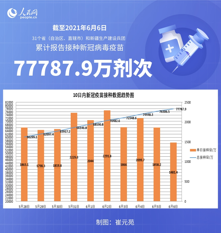 國(guó)家衛(wèi)健委:截至6月6日全國(guó)累計(jì)接種新冠病毒疫苗77787.9萬(wàn)劑次