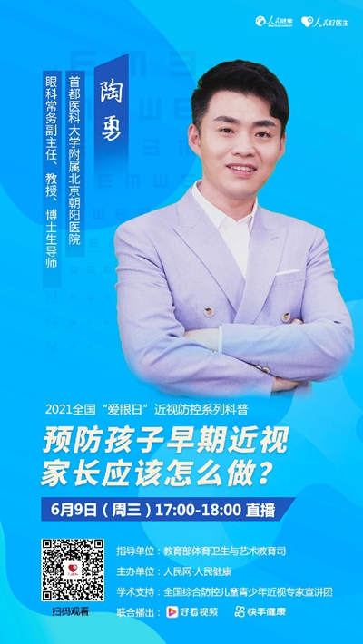 6月9日17:00至18:00,人民日報社旗下新媒體平臺“人民好醫(yī)生”將邀請到首都醫(yī)科大學(xué)附屬北京朝陽醫(yī)院眼科常務(wù)副主任陶勇做客演播室,為公眾普及青少年早期近視相關(guān)知識,千萬不要錯過。