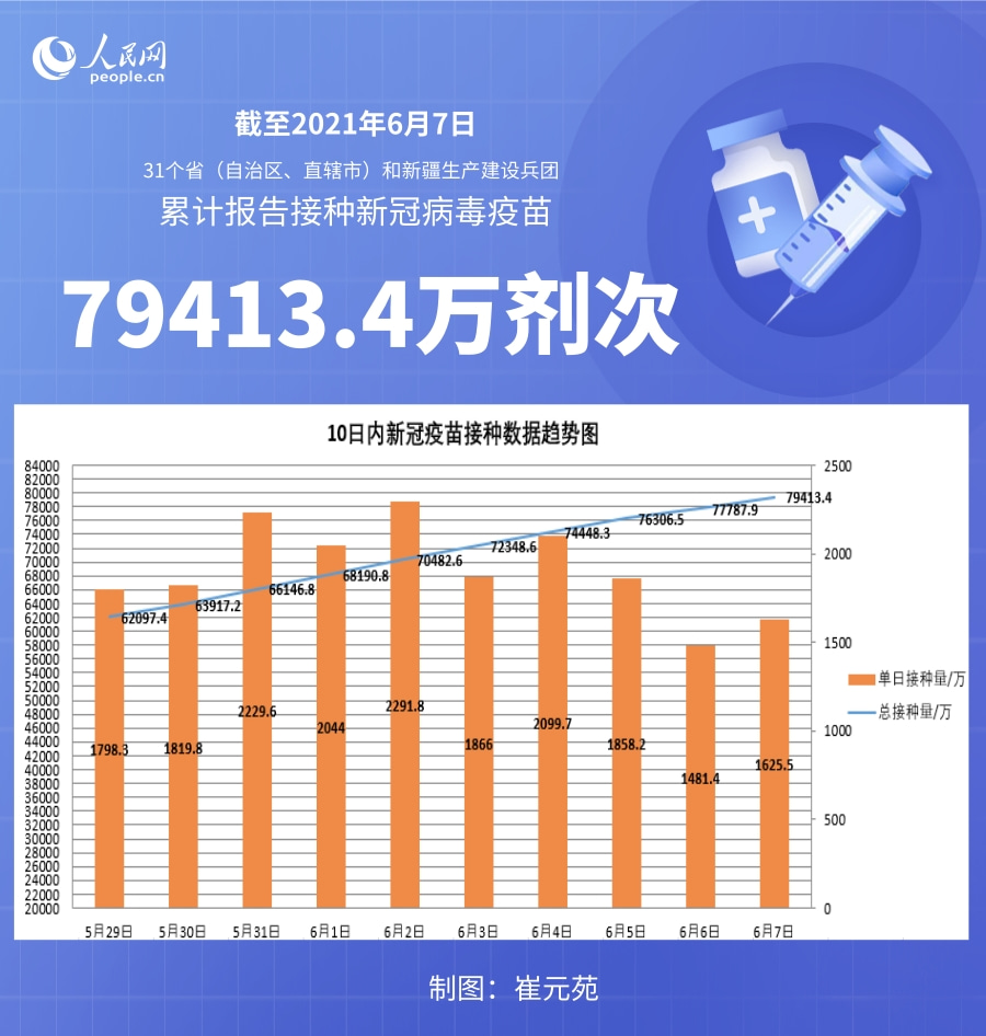 國家衛(wèi)健委:截至6月7日全國累計接種新冠病毒疫苗79413.4萬劑次