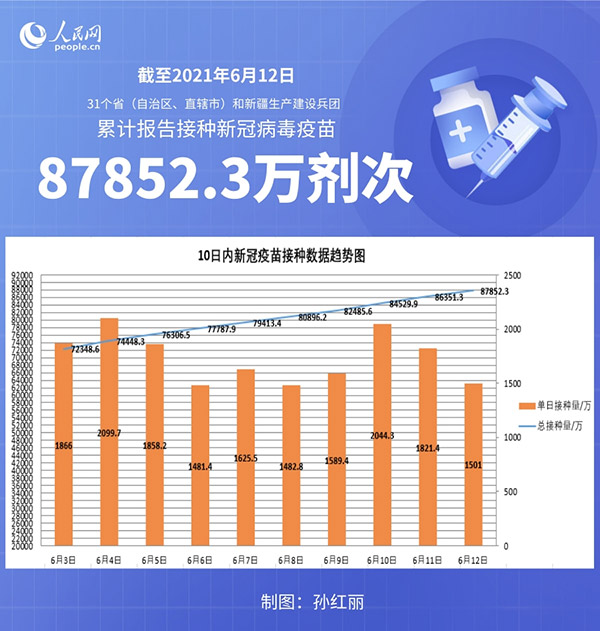 人民網(wǎng)北京6月13日電 (記者孫紅麗)據(jù)國(guó)家衛(wèi)生健康委官網(wǎng)消息,截至2021年6月12日,31個(gè)省(自治區(qū)、直轄市)和新疆生產(chǎn)建設(shè)兵團(tuán)累計(jì)報(bào)告接種新冠病毒疫苗87852.3萬(wàn)劑次。