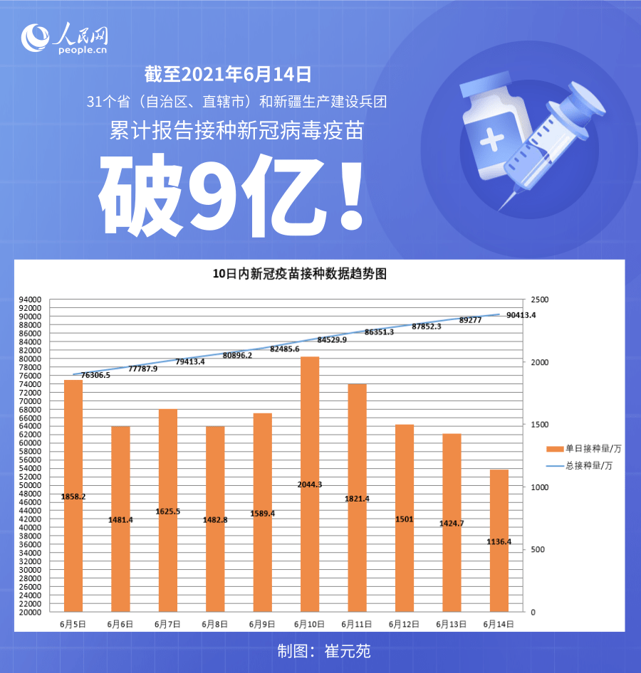 人民網(wǎng)北京6月15日電 (記者崔元苑)據(jù)國(guó)家衛(wèi)生健康委官網(wǎng)消息,截至2021年6月14日,31個(gè)。ㄗ灾螀^(qū)、直轄市)和新疆生產(chǎn)建設(shè)兵團(tuán)累計(jì)報(bào)告接種新冠病毒疫苗90413.4萬(wàn)劑次。