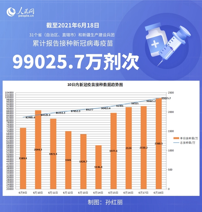 人民網(wǎng)北京6月19日電 (記者孫紅麗)據(jù)國(guó)家衛(wèi)生健康委官網(wǎng)消息,截至2021年6月18日,31個(gè)。ㄗ灾螀^(qū)、直轄市)和新疆生產(chǎn)建設(shè)兵團(tuán)累計(jì)報(bào)告接種新冠病毒疫苗99025.7萬(wàn)劑次。