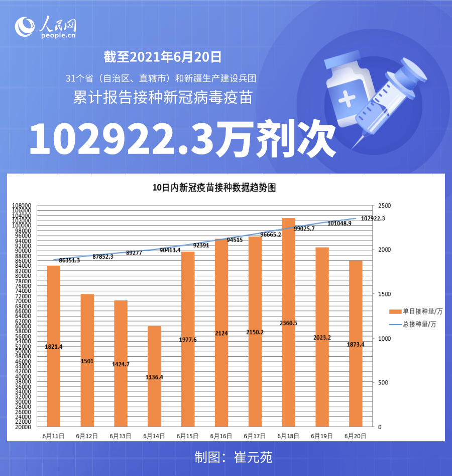 人民網(wǎng)北京6月21日電 (記者崔元苑)據(jù)國家衛(wèi)生健康委官網(wǎng)消息,截至2021年6月20日,31個省(自治區(qū)、直轄市)和新疆生產(chǎn)建設兵團累計報告接種新冠病毒疫苗102922.3萬劑次。