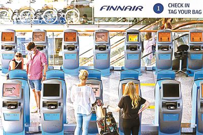 芬蘭21日起放寬新冠疫情下的入境限制。圖為旅客在芬蘭赫爾辛基機(jī)場辦理自助值機(jī)手續(xù) 供圖/新華社