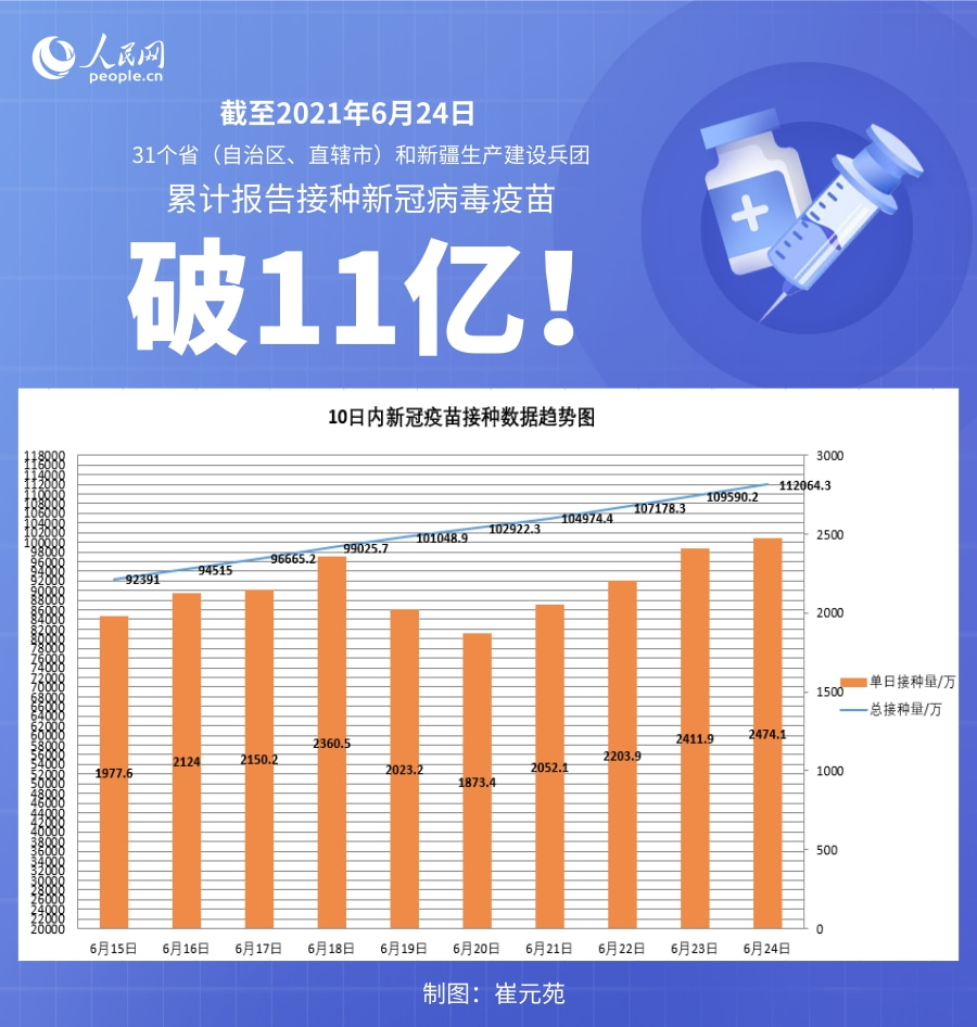 人民網(wǎng)北京6月25日電 (記者崔元苑)據(jù)國家衛(wèi)生健康委官網(wǎng)消息,截至2021年6月24日,31個。ㄗ灾螀^(qū)、直轄市)和新疆生產(chǎn)建設(shè)兵團累計報告接種新冠病毒疫苗112064.3萬劑次。