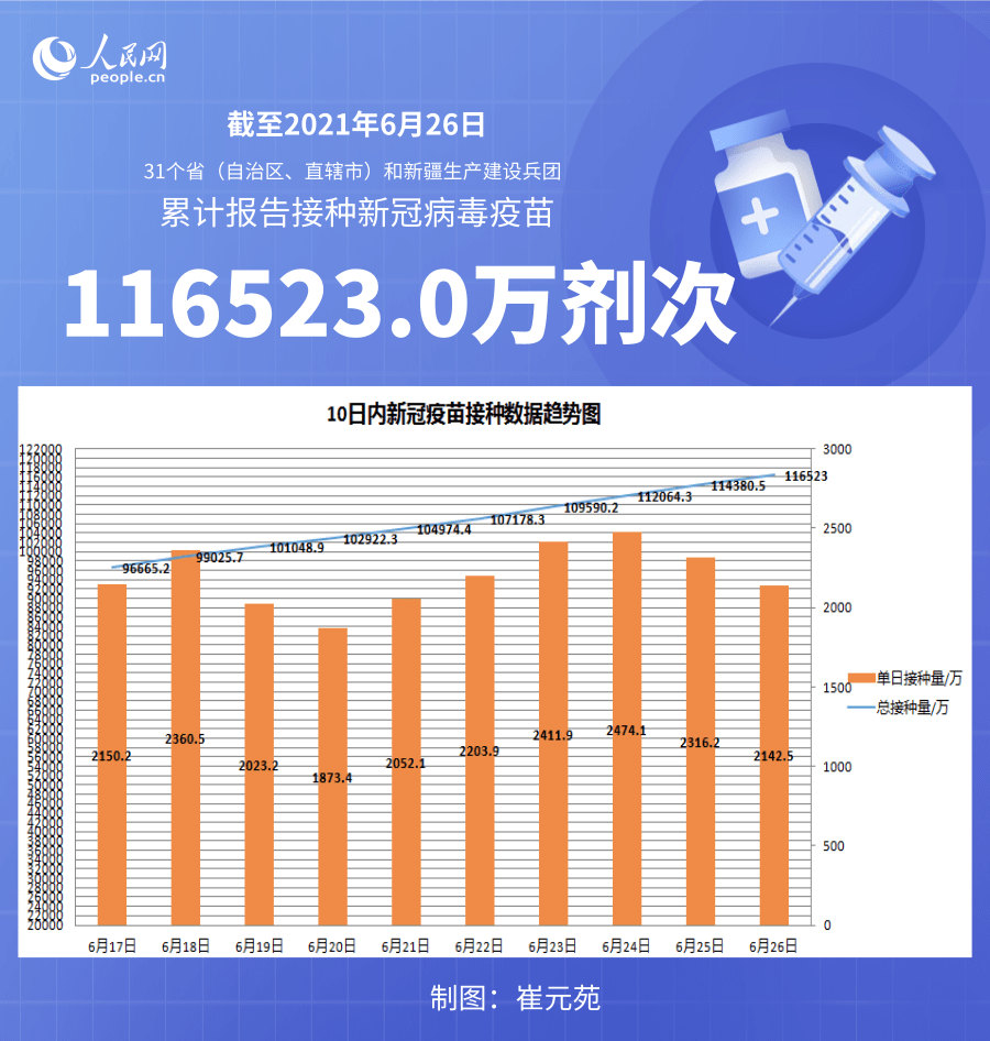 國家衛(wèi)健委:截至6月26日全國累計(jì)接種新冠病毒疫苗116523.0萬劑次