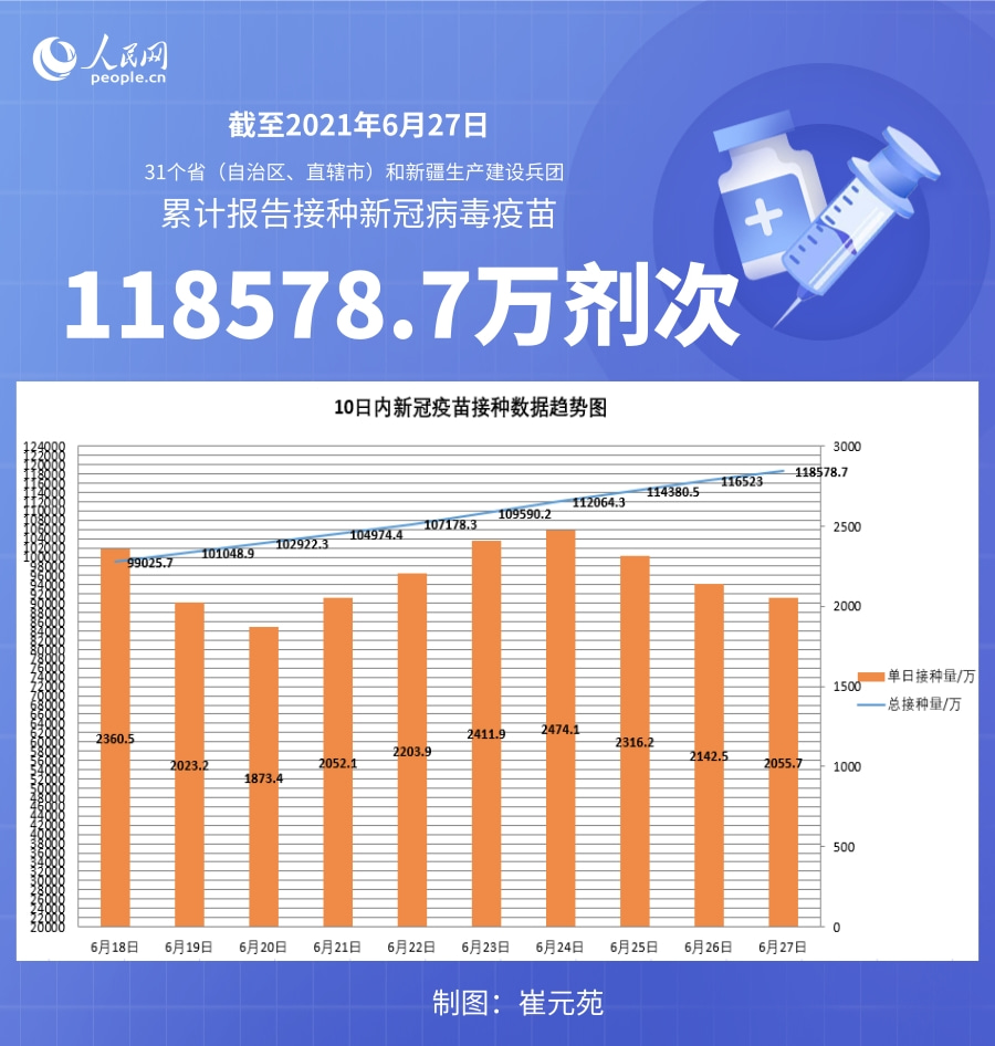 國家衛(wèi)健委:截至6月27日全國累計接種新冠病毒疫苗118578.7萬劑次