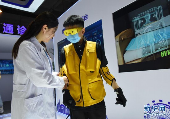 7月3日,一名參觀者在展會上通過穿戴道具體驗“老年生活”。