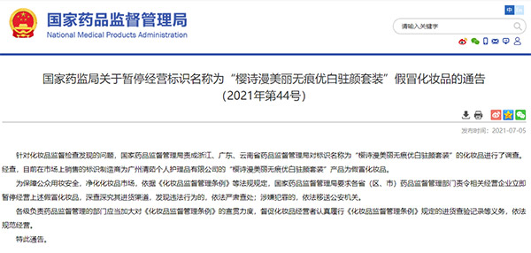 國(guó)家藥監(jiān)局:“櫻詩(shī)漫美麗無(wú)痕優(yōu)白駐顏套裝”為假冒化妝品
