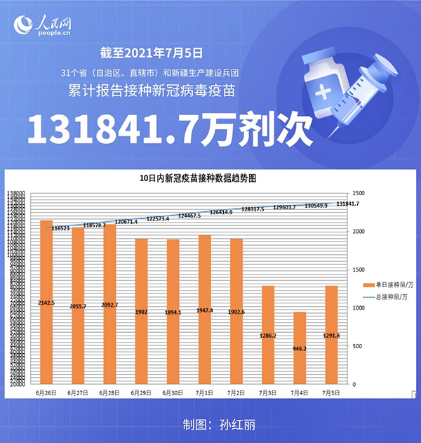 人民網(wǎng)北京7月6日電 (記者孫紅麗)據(jù)國家衛(wèi)生健康委官網(wǎng)消息,截至2021年7月5日,31個。ㄗ灾螀^(qū)、直轄市)和新疆生產(chǎn)建設兵團累計報告接種新冠病毒疫苗131841.7萬劑次。