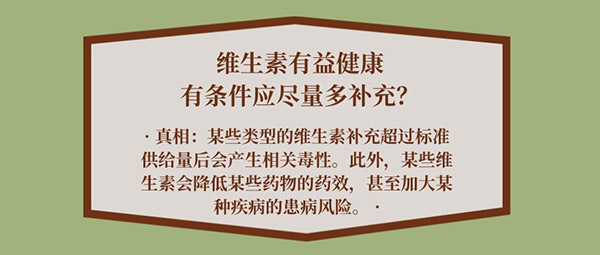 真相是,某些類型的維生素補充超過標準供給量后會產(chǎn)生相關(guān)毒性。其中,過量攝入維生素A和維生素D可能具有的毒性潛能最大,中等毒性潛能的是煙酸(即維生素B3),其他為低毒性潛能或是可忽略的毒性潛能。