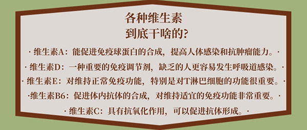 維生素A能促進免疫球蛋白的合成,提高人體感染和抗腫瘤能力;維生素A還能消除免疫耐受。影響免疫反應的各種細胞因子也可能在維生素A缺乏時發(fā)生改變,從而影響體內(nèi)抗原-抗體反應。