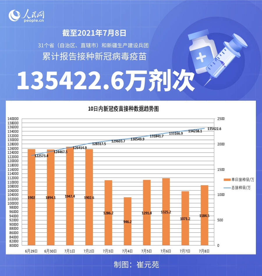 人民網(wǎng)北京7月9日電 (記者崔元苑)據(jù)國(guó)家衛(wèi)生健康委官網(wǎng)消息,截至2021年7月8日,31個(gè)。ㄗ灾螀^(qū)、直轄市)和新疆生產(chǎn)建設(shè)兵團(tuán)累計(jì)報(bào)告接種新冠病毒疫苗135422.6萬(wàn)劑次。