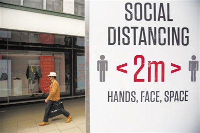 圖為在英國(guó)倫敦,一名男子從提示人們保持社交距離的牌子旁走過(guò)。