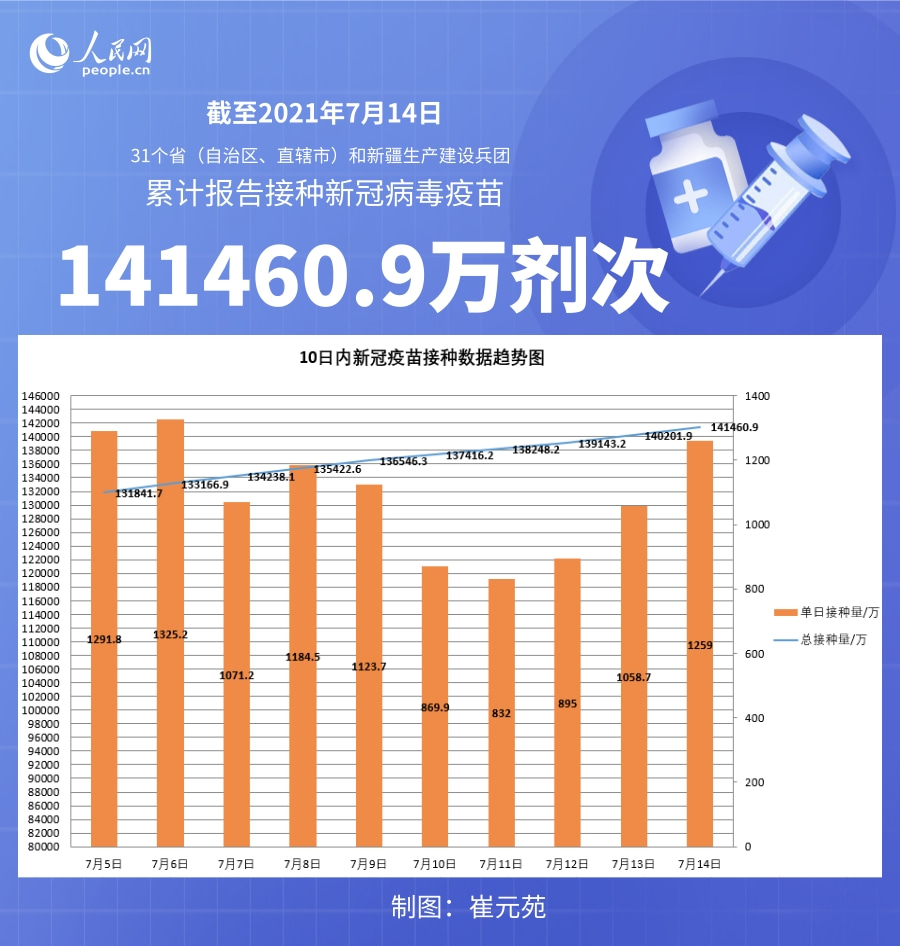 人民網(wǎng)北京7月15日電 (記者崔元苑)據(jù)國家衛(wèi)生健康委官網(wǎng)消息,截至2021年7月14日,31個(gè)。ㄗ灾螀^(qū)、直轄市)和新疆生產(chǎn)建設(shè)兵團(tuán)累計(jì)報(bào)告接種新冠病毒疫苗141460.9萬劑次。
