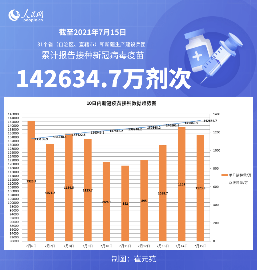 人民網(wǎng)北京7月16日電 (記者崔元苑)據(jù)國家衛(wèi)生健康委官網(wǎng)消息,截至2021年7月15日,31個。ㄗ灾螀^(qū)、直轄市)和新疆生產(chǎn)建設(shè)兵團累計報告接種新冠病毒疫苗142634.7萬劑次。