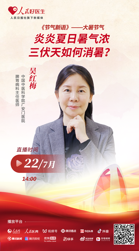 7月22日14:00我們將邀請到中國中醫(yī)科學(xué)院廣安門醫(yī)院脾胃病科主任醫(yī)師吳紅梅做客演播室,為大家講解大暑節(jié)氣養(yǎng)生知識,千萬不要錯過。