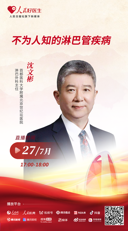 7月27日17:00-18:00,“人民好醫(yī)生”客戶端將邀請首都醫(yī)科大學附屬北京世紀壇醫(yī)院淋巴外科主任沈文彬進行視頻直播,給大家科普淋巴管疾病診療的相關知識,千萬不要錯過。