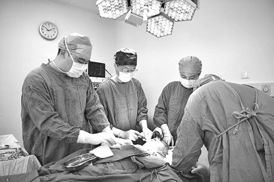 南方醫(yī)科大學(xué)南方醫(yī)院整形外科主任胡志奇(左二)為“面具男孩”周濤做手術(shù)。新華社發(fā)