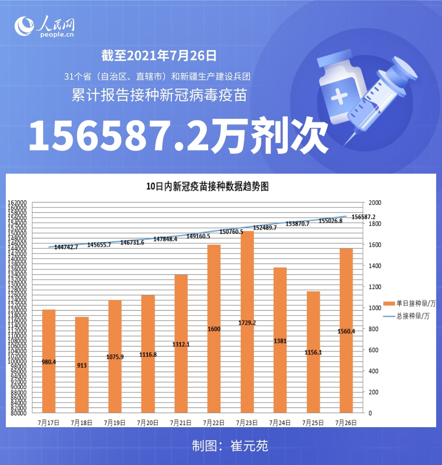國(guó)家衛(wèi)健委:截至7月26日全國(guó)累計(jì)接種新冠病毒疫苗156587.2萬(wàn)劑次