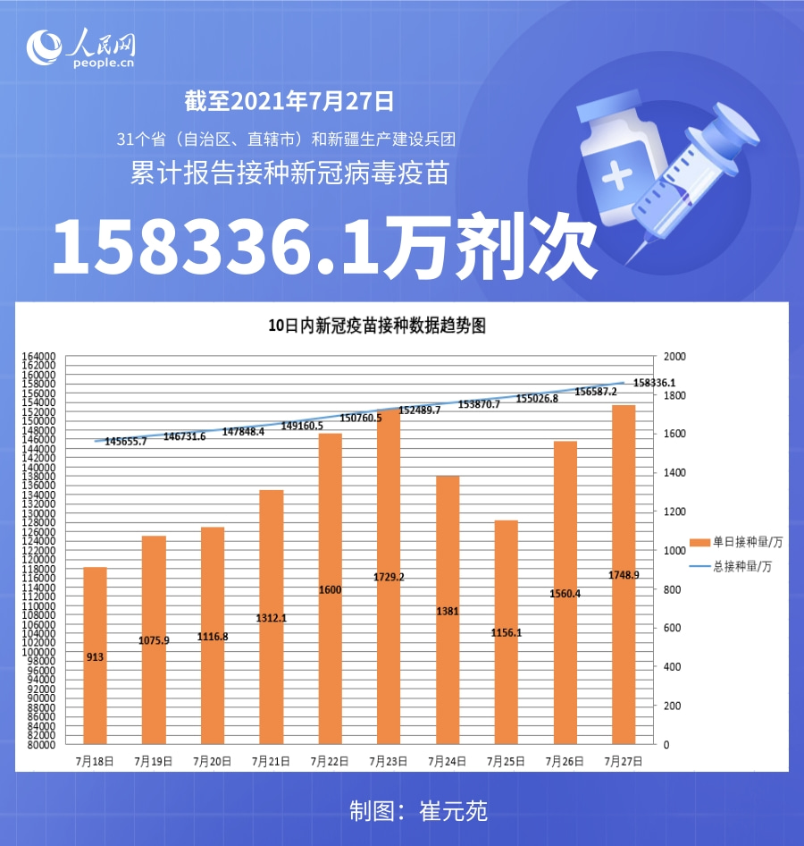人民網(wǎng)北京7月28日電 (記者崔元苑)據(jù)國家衛(wèi)生健康委官網(wǎng)消息,截至2021年7月27日,31個。ㄗ灾螀^(qū)、直轄市)和新疆生產(chǎn)建設(shè)兵團累計報告接種新冠病毒疫苗158336.1萬劑次。