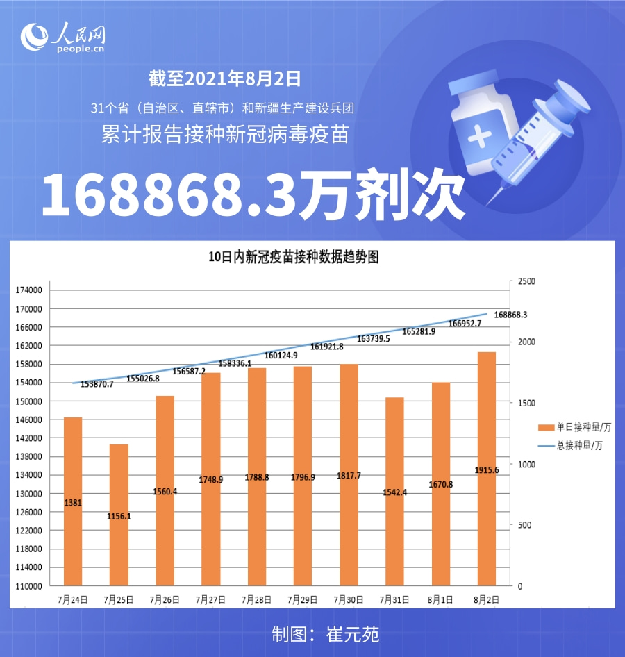人民網(wǎng)北京8月3日電 (記者崔元苑)據(jù)國(guó)家衛(wèi)生健康委官網(wǎng)消息,截至2021年8月2日,31個(gè)。ㄗ灾螀^(qū)、直轄市)和新疆生產(chǎn)建設(shè)兵團(tuán)累計(jì)報(bào)告接種新冠病毒疫苗168868.3萬(wàn)劑次。