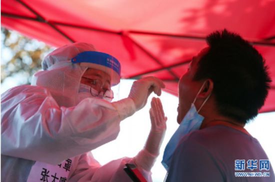 8月2日,在鄭州市鄭東新區(qū)一個(gè)核酸檢測(cè)點(diǎn),醫(yī)務(wù)人員為市民進(jìn)行核酸檢測(cè)取樣。