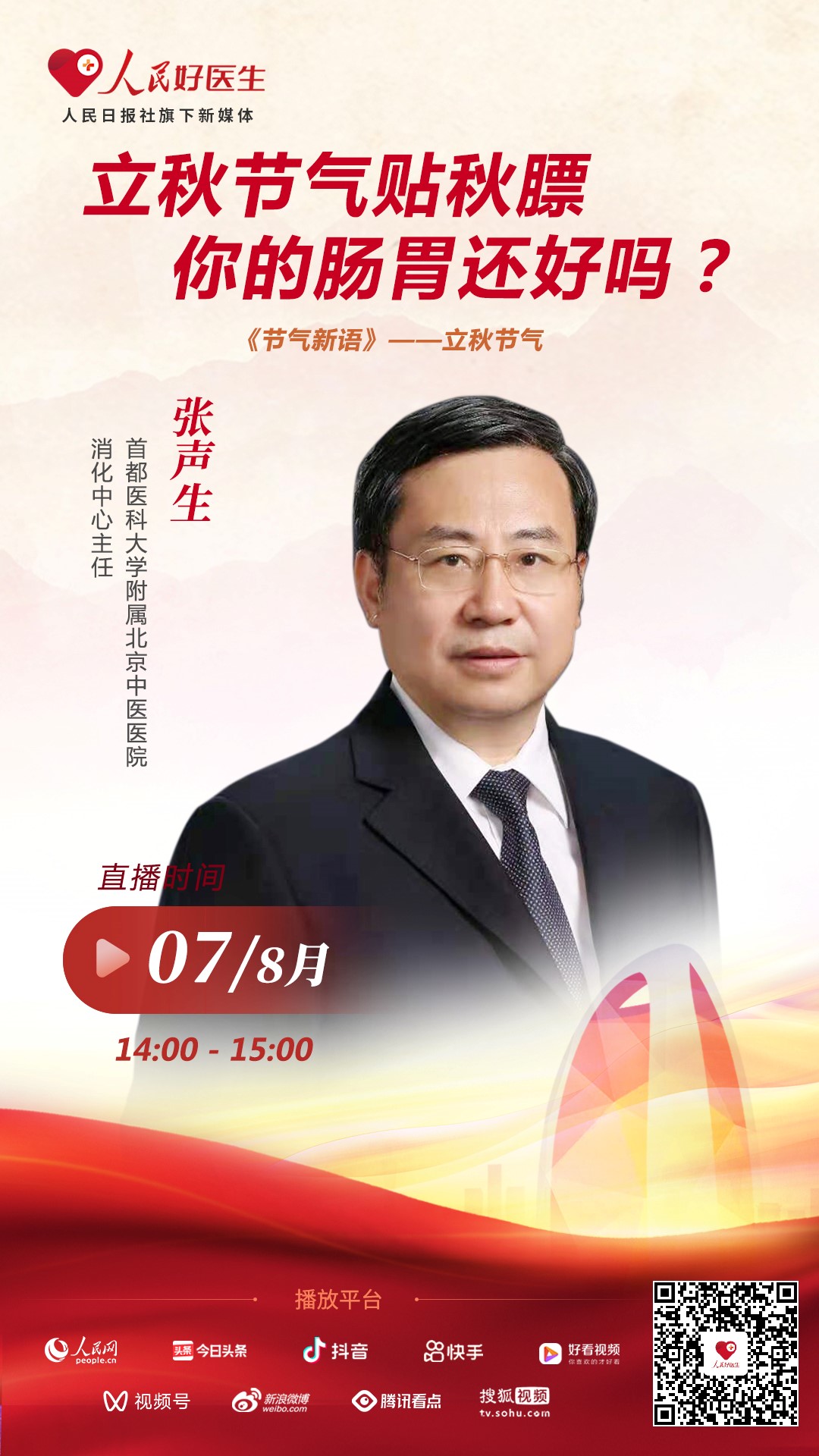 8月7日14:00,我們將邀請(qǐng)到首都醫(yī)科大學(xué)附屬北京中醫(yī)醫(yī)院消化中心主任張聲生做客演播室,為大家講解立秋節(jié)氣養(yǎng)生知識(shí)。