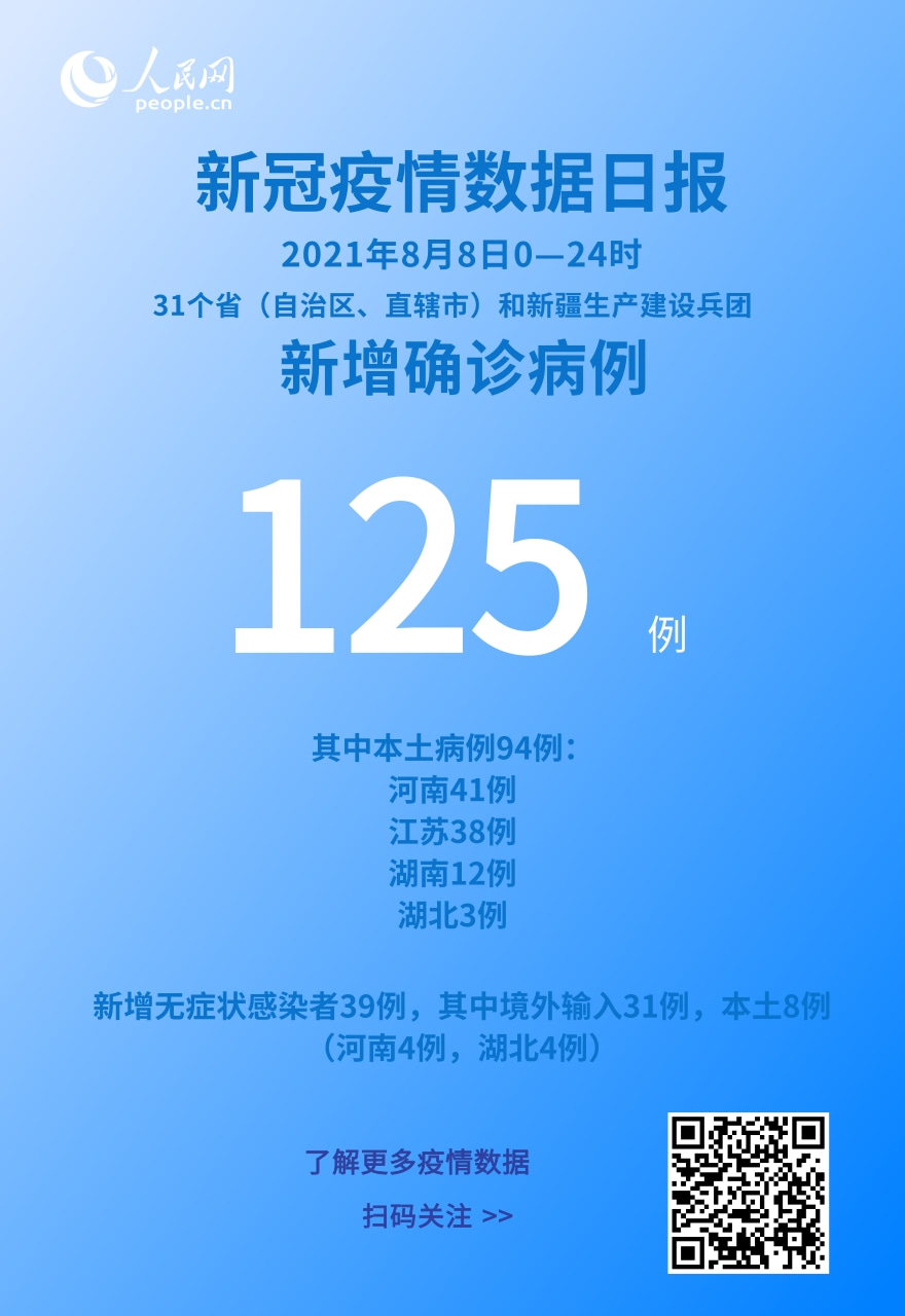 人民網(wǎng)北京8月9日電 (記者崔元苑)今日,國(guó)家衛(wèi)生健康委于官網(wǎng)發(fā)布了截至8月8日24時(shí)新型冠狀病毒肺炎疫情最新情況。8月8日0—24時(shí),31個(gè)。ㄗ灾螀^(qū)、直轄市)和新疆生產(chǎn)建設(shè)兵團(tuán)報(bào)告新增確診病例125例,其中境外輸入病例31例(上海8例,廣東8例,云南8例,北京3例,內(nèi)蒙古1例,浙江1例,四川1例,陜西1例),本土病例94例(河南41例,江蘇38例,湖南12例,湖北3例);無(wú)新增死亡病例;無(wú)新增疑似病例。