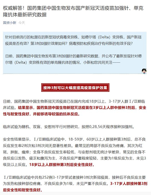最新!國藥集團(tuán)中國生物公布研究數(shù)據(jù):接種3劑新冠滅活疫苗可大幅提高保護(hù)效果