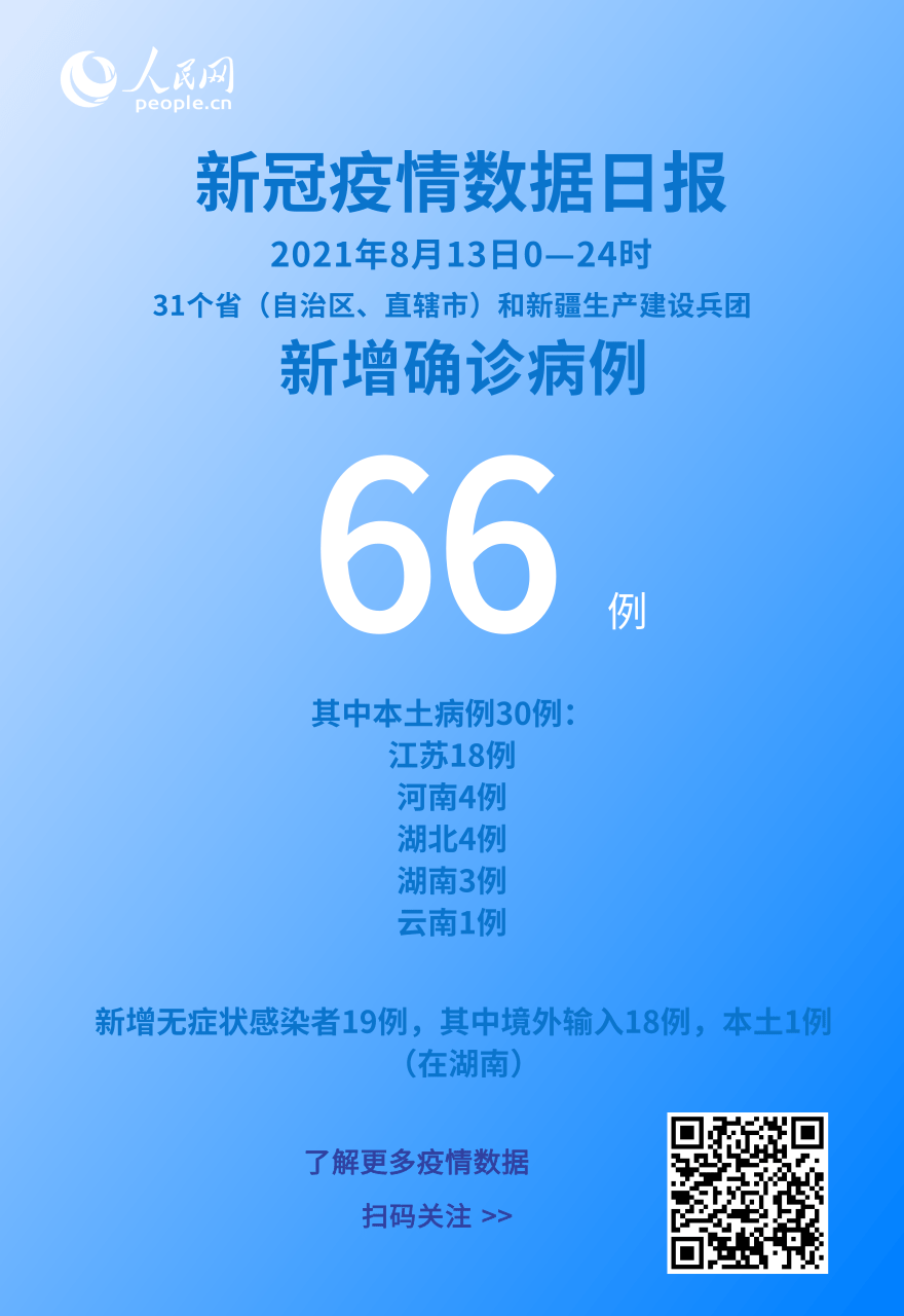 人民網(wǎng)北京8月14日電 (記者崔元苑)今日,國(guó)家衛(wèi)生健康委于官網(wǎng)發(fā)布了截至8月13日24時(shí)新型冠狀病毒肺炎疫情最新情況。8月13日0—24時(shí),31個(gè)。ㄗ灾螀^(qū)、直轄市)和新疆生產(chǎn)建設(shè)兵團(tuán)報(bào)告新增確診病例66例,其中境外輸入病例36例(福建11例,上海5例,云南5例,山東4例,四川4例,廣東3例,天津2例,遼寧1例,陜西1例),本土病例30例(江蘇18例,河南4例,湖北4例,湖南3例,云南1例);無(wú)新增死亡病例;無(wú)新增疑似病例。