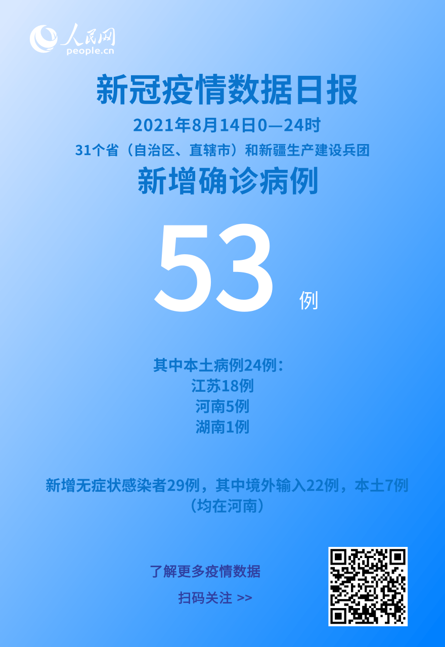 人民網(wǎng)北京8月15日電 (記者崔元苑)今日,國(guó)家衛(wèi)生健康委于官網(wǎng)發(fā)布了截至8月14日24時(shí)新型冠狀病毒肺炎疫情最新情況。8月14日0—24時(shí),31個(gè)。ㄗ灾螀^(qū)、直轄市)和新疆生產(chǎn)建設(shè)兵團(tuán)報(bào)告新增確診病例53例,其中境外輸入病例29例(廣東13例,上海6例,天津3例,山東3例,云南3例,福建1例),本土病例24例(江蘇18例,河南5例,湖南1例);無新增死亡病例;無新增疑似病例。