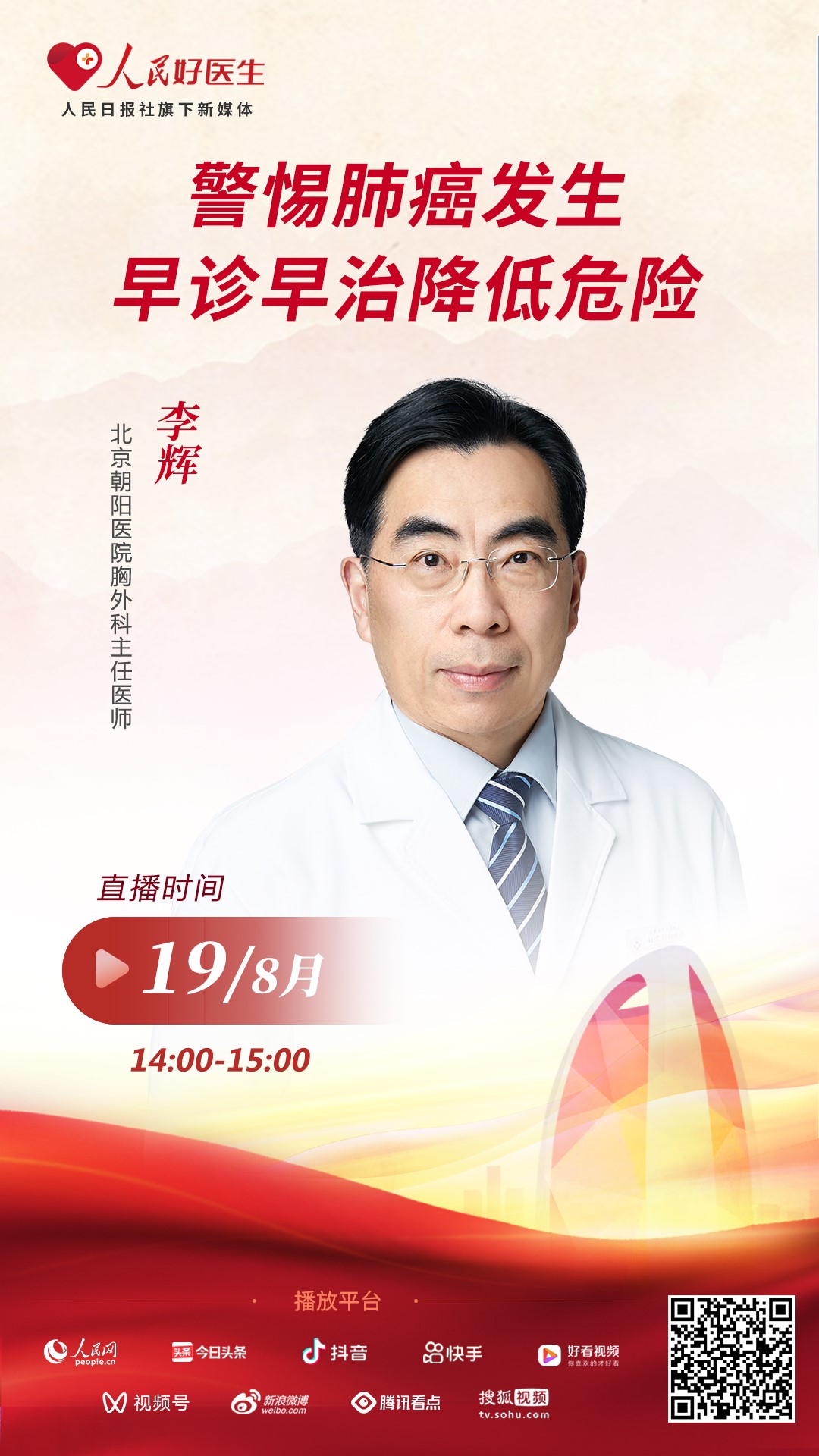 8月19日14:00-15:00,“人民好醫(yī)生”客戶端將邀請北京朝陽醫(yī)院胸外科主任醫(yī)師李輝,就肺部健康的相關(guān)內(nèi)容進(jìn)行科普直播,歡迎大家收看!