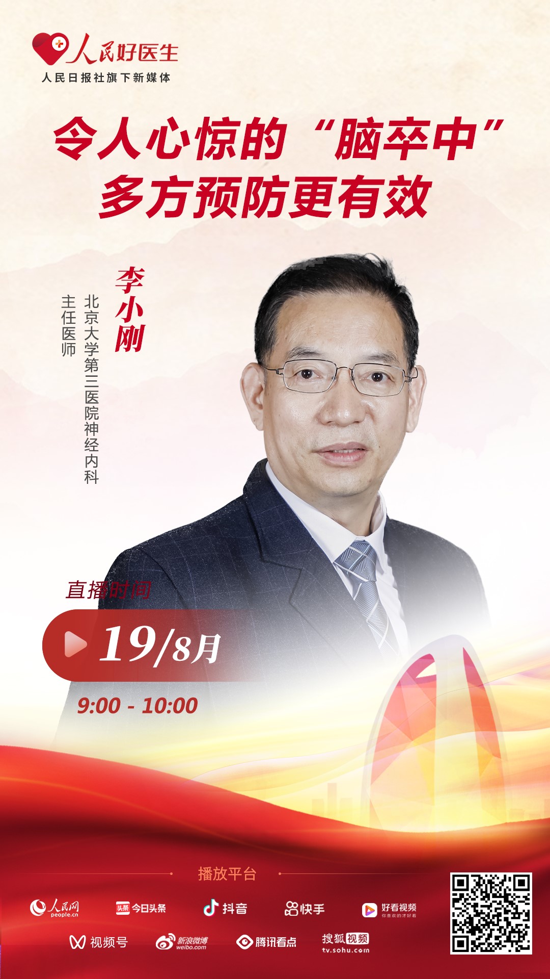 8月19日9:00-10:00,“人民好醫(yī)生”客戶端將邀請北京大學第三醫(yī)院神經(jīng)內(nèi)科主任醫(yī)師李小剛,就心血管健康的相關內(nèi)容進行科普直播,歡迎大家收看!