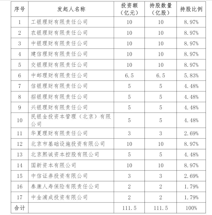 根據(jù)公告,國(guó)民養(yǎng)老保險(xiǎn)公司發(fā)起人分別為,工銀理財(cái)、農(nóng)銀理財(cái)、中銀理財(cái)、建信理財(cái)、交銀理財(cái)各投資10億元,持股比例均為8.97%;中郵理財(cái)投資6.5億元,持股比例5.83%;信銀理財(cái)、招銀理財(cái)、興銀理財(cái)、民銀金投資本管理(北京)有限公司各投資5億元,持股比例同為4.48%;華夏理財(cái)投資3億元、持股2.69%;北京市基礎(chǔ)設(shè)施投資有限公司投資10億元,持股8.97%;北京熙誠(chéng)資本控股有限公司出資5億元,持股4.48%;國(guó)新資本出資10億元,持股8.97%;中信證券投資有限公司出資3億元,持股2.69%;泰康人壽投資2億元,持股1.79%;中金浦成投資有限公司出資2億元,持股1.79%。