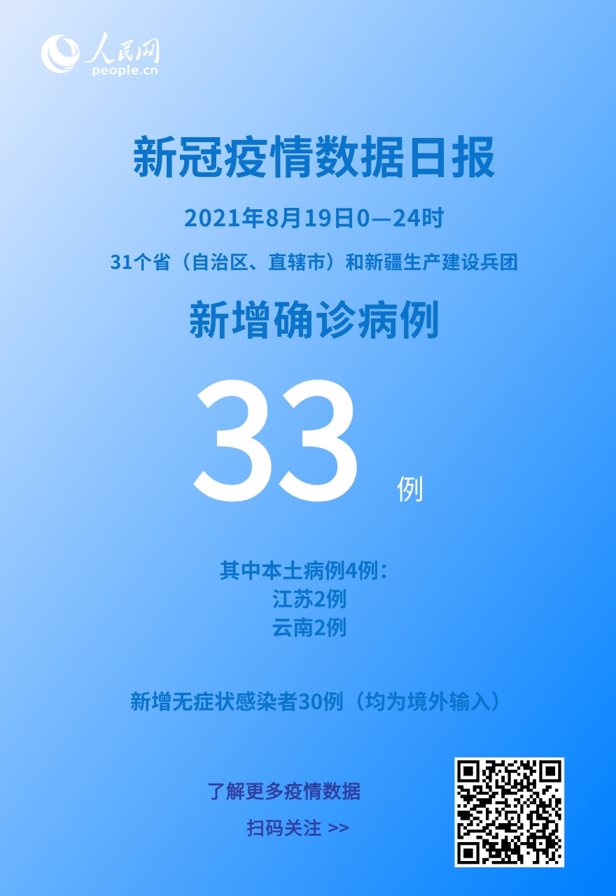 人民網(wǎng)北京8月20日電 (記者崔元苑)今日,國家衛(wèi)生健康委于官網(wǎng)發(fā)布了截至8月19日24時(shí)新型冠狀病毒肺炎疫情最新情況。8月19日0—24時(shí),31個(gè)。ㄗ灾螀^(qū)、直轄市)和新疆生產(chǎn)建設(shè)兵團(tuán)報(bào)告新增確診病例33例,其中境外輸入病例29例(廣東9例,云南6例,北京2例,遼寧2例,上海2例,福建2例,河南2例,天津1例,黑龍江1例,江蘇1例,四川1例),本土病例4例(江蘇2例,云南2例);無新增死亡病例;新增疑似病例2例,均為境外輸入病例(均在上海)。