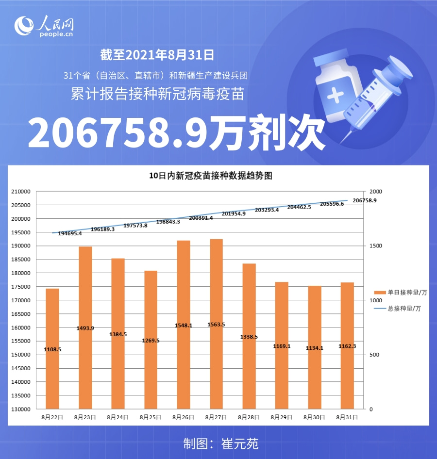 人民網(wǎng)北京9月1日電 (記者崔元苑)據(jù)國家衛(wèi)生健康委官網(wǎng)消息,截至2021年8月31日,31個(gè)。ㄗ灾螀^(qū)、直轄市)和新疆生產(chǎn)建設(shè)兵團(tuán)累計(jì)報(bào)告接種新冠病毒疫苗206758.9萬劑次。