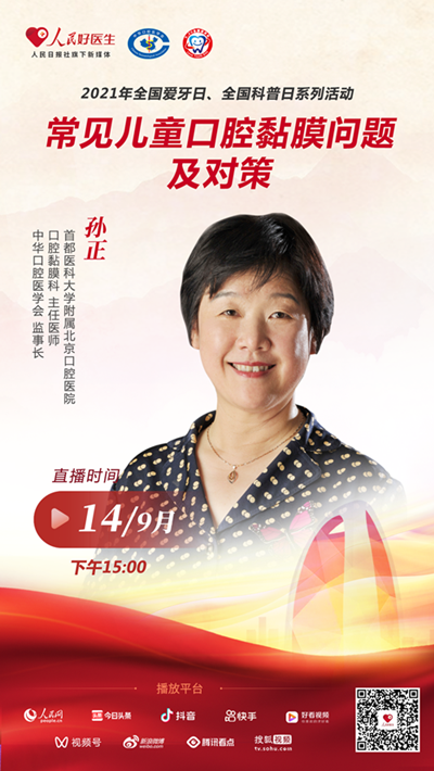 9月14日15:00-16:00,我們將邀請(qǐng)首都醫(yī)科大學(xué)附屬北京口腔醫(yī)院 黏膜科主任醫(yī)師孫正做客人民好醫(yī)生名醫(yī)直播欄目,給大家科普常見(jiàn)的兒童口腔黏膜問(wèn)題及應(yīng)對(duì)對(duì)策。