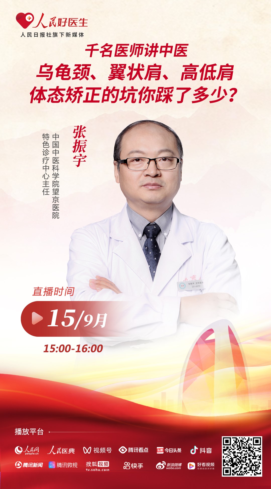 9月15日15:00-16:00,人民日?qǐng)?bào)社旗下新媒體平臺(tái)“人民好醫(yī)生”與國(guó)家中醫(yī)藥管理局辦公室聯(lián)合推出的“千名醫(yī)師講中醫(yī)”系列直播將邀請(qǐng)中國(guó)中醫(yī)科學(xué)院望京醫(yī)院特色診療中心主任張振宇做客直播間,為大眾詳細(xì)科普體態(tài)矯正的正確做法。