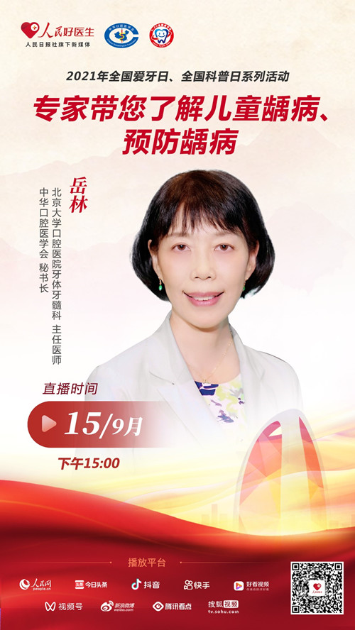 9月15日15:00-16:00,我們將邀請(qǐng)北京大學(xué)口腔醫(yī)院牙體牙髓科主任醫(yī)師,中華口腔醫(yī)學(xué)會(huì)秘書(shū)長(zhǎng)岳林做客人民好醫(yī)生名醫(yī)直播欄目,帶您了解兒童齲病、預(yù)防齲病。