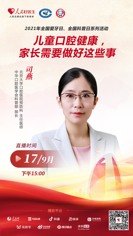 9月17日15:00—16:00,我們將邀請北京大學(xué)口腔醫(yī)院預(yù)防科主任醫(yī)師、中華口腔醫(yī)學(xué)會科普部部長司燕做客人民好醫(yī)生名醫(yī)直播欄目,給大家科普關(guān)注兒童口腔健康問題,作為家長需要做好的那些事。