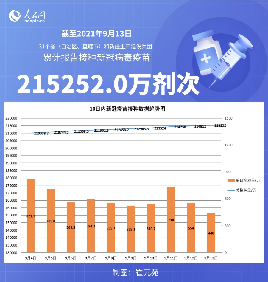 人民網(wǎng)北京9月14日電 (記者崔元苑)據(jù)國家衛(wèi)生健康委官網(wǎng)消息,截至2021年9月13日,31個省(自治區(qū)、直轄市)和新疆生產(chǎn)建設(shè)兵團(tuán)累計(jì)報(bào)告接種新冠病毒疫苗215252.0萬劑次。