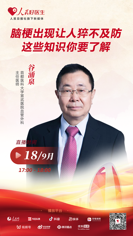 9月18日17:00至18:00首都醫(yī)科大學宣武醫(yī)院血管外科主任醫(yī)師谷涌泉做客人民好醫(yī)生名醫(yī)直播欄目。給公眾科普腦梗知識,敬請期待。