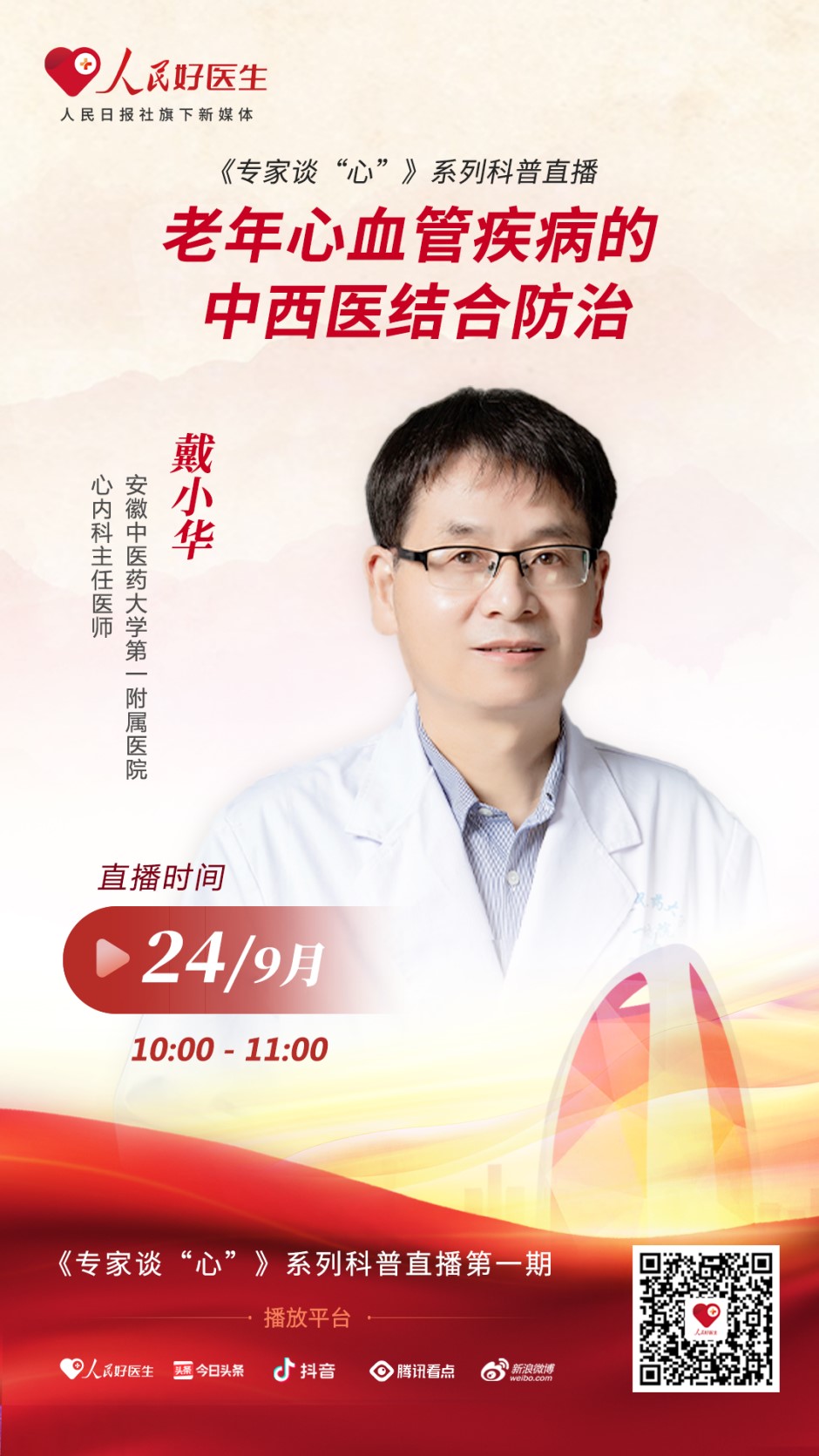 9月24日10:00-11:00,安徽中醫(yī)藥大學(xué)第一附屬醫(yī)院心內(nèi)科主任醫(yī)師戴小華將做客“人民好醫(yī)生”APP直播間,為大眾科普老年心血管疾病的防治知識(shí)。歡迎屆時(shí)收看。